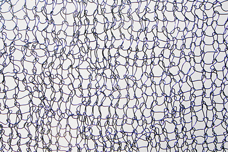 Mit feinem Draht hat sie zu diesem Thema gearbeitet. Sie hat eine Familie entdeckt im Entlebuch, die farbigen Draht für die Chip-Herstellung fabriziert, viele schöne Farben. Damit strickt sie. Manchmal fädelt sie Glasperlen, Pailletten, Glitzersteine in den Drahtstrick.