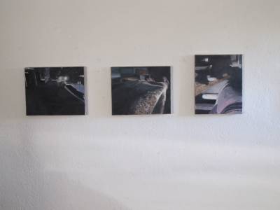 Auch die tägliche Zeichnung gehörte zum Ritual der Künstlerin. Zusammen ergeben diese Blätter das Tagebuch ihres Aufenthaltes. Malen konnte Regula Weber tagsüber schlecht, weil das Licht so grell ins Atelier fiel. Deshalb verlegte sie sich darauf, abends und nachts zu malen. Und die Nacht bestimmte dann die Atmosphäre der Ölbilder. Es sind nächtliche Szenen aus der Umgebung der Casa Atelier: eine Tankstelle, in der Möbel und Teppiche gelagert werden, die weisse Nachbarskatze im Garten – nicht herzig, sondern eher geheimnisvoll-unheimlich… Regula Weber beleuchtete die Motive mit dem Scheinwerfer ihres Autos oder ihrer Taschenlampe, fotografierte sie und malte sie dann im Atelier. Mehrfach übermalt, bleiben Spuren früherer Formen und Farben auf den Bildern. Vor einem Lokal im Dunkeln sind weisse Plastikstühle aufgeschichtet: eine ganz konkrete, alltägliche Szene, und gleichzeitig ein Bild für das Vergängliche. Abend? Saisonende? Betriebsende? – Es bleibt in der Schwebe, sachlich und melancholisch.