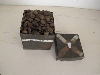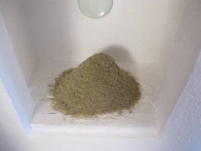 Da war zum Beispiel der Blumenstrauss, den sie sich gleich am ersten Abend pflückte, um es sich wohnlich einzurichten. Regula Weber fand die Blumen im Garten und meinte, es sei Kamille, die als Heilpflanze ihr leises Heimweh etwas lindern könnte … Tatsächlich handelt es sich um das sogenannte Berufskraut. Die Künstlerin pflückte jeden Tag einen Strauss davon und stellte die Sträusse nebeneinander auf den Küchentisch. Die Blütenblätter lösten sich und fielen auf die Tischplatte, wo Regula Weber sie aufsammelte. So entstanden ganze Krüge voll Blättchen, die sie in der Ateliernische zu einem Haufen zusammenschüttete. Wie der heruntergerieselte Sand einer Sanduhr zeigt dieser Haufen das Vergehen der Zeit, im Verblühen und Fallen der Blütenblätter.