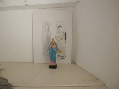 Ein weiteres Ritual waren die täglichen Spaziergänge. Jeden Morgen ging Regula Weber den gleichen Weg, der sie an mindestens fünf verschiedenen Kapellen vorbeiführte, und besuchte den Friedhof von Bedigliora. So kamen Motive hinzu, die ihr unterwegs auffielen: die Madonna, deren Haar- oder Strahlenkranz sie auf den Bildern mit der Dornenkrone Christi assoziiert, ist das Sujet der Einladungskarte. An Dornen oder Nägel am Kreuz lassen auch die leeren Blütenstiele denken, die Regula Weber aquarellierte. Auf dem Friedhof berührten sie die Medaillons, die das Foto der Verstorbenen hinter Glas zeigen. In ihrer Installation hat sie statt des Medaillons die runde Linse eines Hellraumprojektors aufgehängt, hinter der ganz leicht eine verblichene Schrift zu sehen ist.