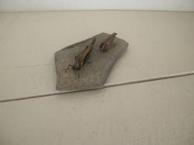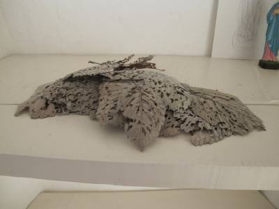 Eine andere Pflanze inspirierte die Gebilde im oberen Teil der Nische: Es ist die Glyzinie, deren Schoten im September schwer und prall vom Balkon hingen. Regula Weber hat sie mit Dreck eingerieben, in Haushaltsfolie eingepackt und zugeklebt, dann die Hüllen wieder geöffnet und leer aufgehängt.