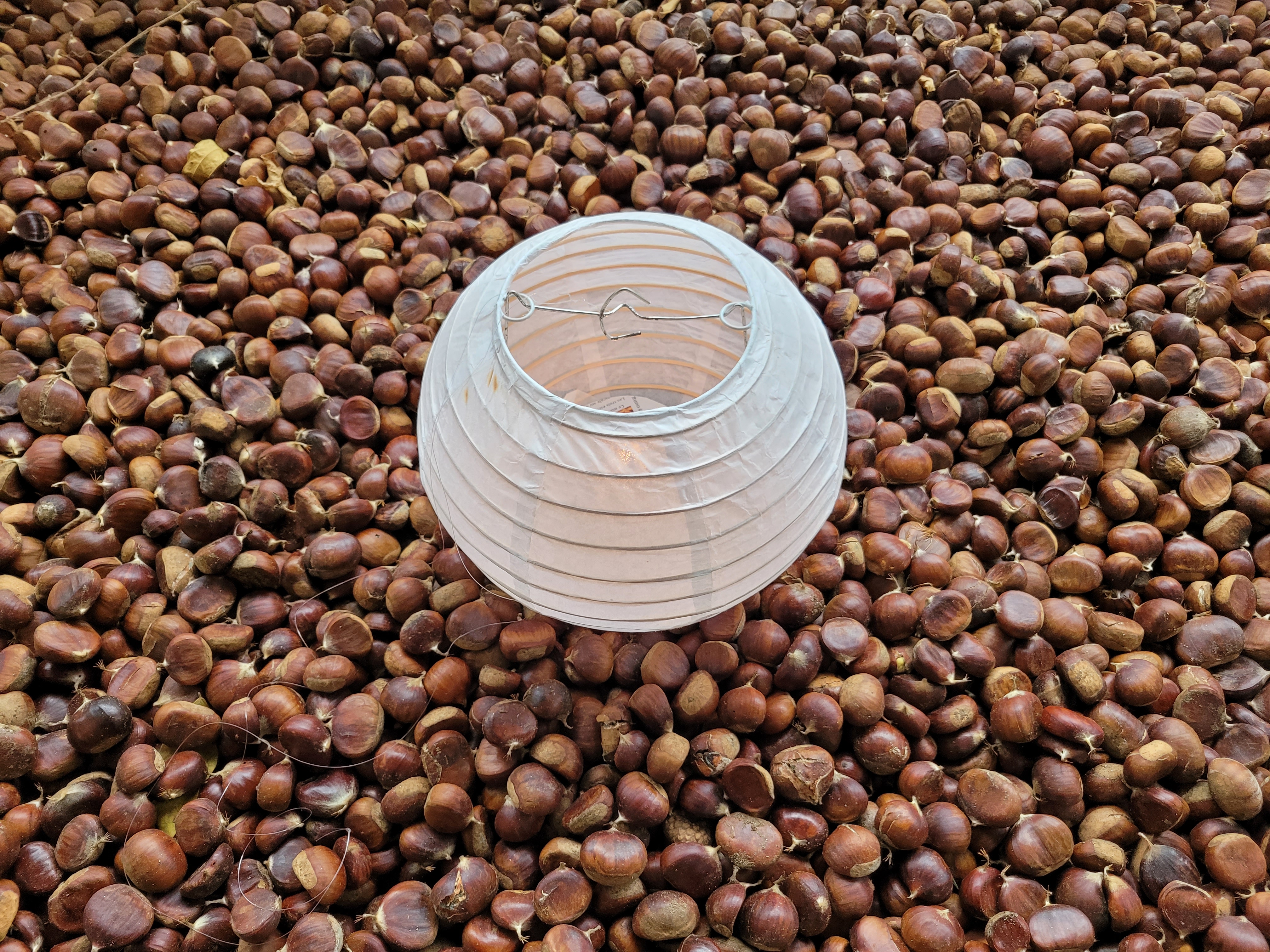 Die Lampenschirme und die Kastanien verweisen aufeinander durch ihre Form, betonen aber auch die Gegensätze von «voll» und «leer», «opak» und «lichtdurchlässig», «hell» und «dunkel». Ihr Aufeinandertreffen schafft einen dritten Raum, indem ein anderes Leben aufscheint. Die Künstlerin arbeitet gerne mit dem Spiegel, weil er den Raum doppelt eröffnet. Und sie arbeitet mit dem, was sie vor Ort findet, auch mit dem Zufall. Es ist eine Kunst des Sammelns und Pflückens – wie man Trauben pflückt oder Kastanien sammelt. «Indem ich die Objekte berühre, mache ich sie zu meiner Kunst,» sagt Jooyoung Kim. «Die physische Arbeit ist mir wichtig.»