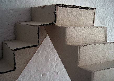 Another motif that fascinated Agneta Stening in her new environment were the stairs: she noticed there were stairs everywhere: outside, in the walking trails, in the gardens, in the village lanes, in front of the houses – and also inside the Casa Atelier. She was intrigued by the stairs and started making them herself, out of the cardboard she had taken with her. When you got the invitation card, maybe you wondered, like me, what size the stair on the photo would be. In my imagination it was quite big, and I was amazed when I saw it really was rather little. This might be because they are so perfectly made, with the black lining emphasizing the contour, and the broken edges, making it look a bit rough and irregular and thus more lively. Maybe it’s also because when we see a stair, we just imagine ourselves on it. A stair is a very concrete thing we use every day, but it is also a symbol for our life. Not that we always climb upstairs – sometimes we also go downstairs, and sometimes, as we can see here, stairs don’t lead anywhere really, we take steps and when we’re up, we see we just have to return downstairs and try some other steps.