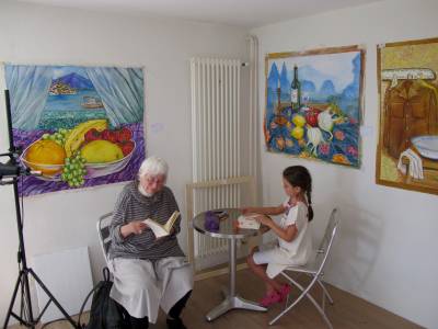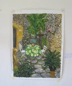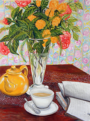 Von Anfang an widmete sich Soledad Tafolla den Stillleben mit Früchten und Blumen und den Naturdarstellungen. Gleich nach ihrer Ankunft in Bedigliora fuhr sie mit ihrer Tochter Sara nach Lugano, um Farben und Leinwand zu kaufen. Das Bild mit den beiden Gläsern auf der Tisch des Cafés vor der Kirche erinnert an diesen Ausflug. Die Künstlerin malt, was sie sieht, aber sie malt auch, wie sie sieht und sehen will. Auf den ersten beiden Bildern, die im Atelier entstanden, ist die neue Umgebung deutlich wiederzuerkennen: einerseits die Aussicht vom Balkon, andrerseits der Blumenstrauss mit dem gelben Krug der Casa Atelier. Eines der beiden Bücher auf dem Tisch ist wohl ein Reiseführer, er trägt den Titel «Svizzera». Die Kaffeetasse mit dem Löffel weisen auf eine gemütliche Pause hin. Die Tapete mit den farbenfrohen Blumen hat Soledad dazu erfunden – wie sie bemerkt, sind in der Schweiz die Wände meistens weiss, und sie hat das Bedürfnis nach einem bewegten Hintergrund. Dekorative, verspielte und farbenfrohe Elemente sind ihr wichtig; Vasen und Krüge stehen häufig auf einer spitzen- oder blumenbesetzten Decke. In den dargestellten Wohnzimmern hängen Bilder und Spiegel, stehen kleine Statuen, Glaskugeln und natürlich immer Blumen oder Fruchtschalen.
