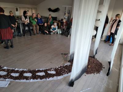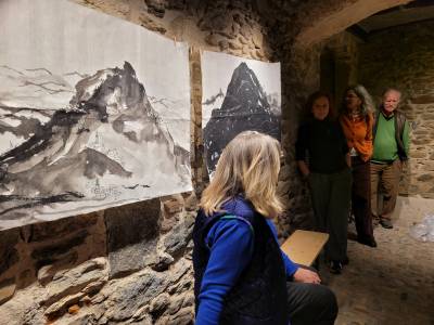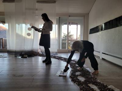 Die Künstlerin arbeitet an den Schnittstellen von Philosophie, Religion, Geisteswissenschaften und Kunst. Was sie an einem neuen Ort sucht, ist eigentlich nicht das Schöne – es kann ebenso gut das Hässliche sei. Aber in Bedigliora war sie tatsächlich von der Schönheit überwältigt. Sie war fasziniert von der riesigen Fensterfront des oberen Ateliers, vom ständig wechselnden Licht. Sie liebte die Berge mit ihren ganz diskret eingestreuten Dörfern. Diese Situation der Dörfer am Fuss der Berge hat sie in Tusche gemalt. Sie ist sehr viel spazieren gegangen und hat gefundene Schätze nach Hause gebracht – viele, viele Kastanien. Draus entstand die Installation mit transparenter Gaze, asiatischen Lampenschirmen und dem Weg der Kastanien.